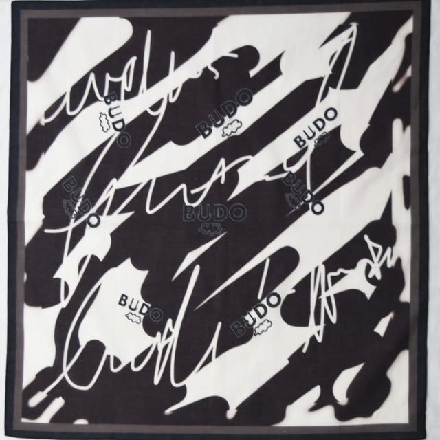 <friends pattern bandana> PRODUCTNo. B26BD201 color: Shadow(ブラック×ブラウン×オフホワイト) ランニングシーンでもコーディネイトに取り入れることが多くなってきたバンダナ。 チーフのようだけでなく、手首などにも巻いてファッション感覚で取り入れるのもおすすめです。 高番手のコットン100%で 上質感と肌なじみも良く、ヘッドやネック周りにも使用しやすいです。また、四方をステッチで縫製していますのでほつれにくい仕立てとなっています。 複数のパターンをレイヤー状にコラージュした、BUDOらしいパターンバンダナをつくりました。 このパターンバンダナのテーマは 「FRIENDS(縁)」。 走ることで生まれる“縁”を、「重なり」「結び」「繋ぎ」という形で重ねていった結果、 この“バンダナ”というアイテムにたどり着きました。 正方形という形はとてもシンプルでクリア。 一般的なバンダナは、四方に同じ柄が出るよう規則的にデザインされていますが、 このバンダナはフリーハンド&不規則に構成され、折り方によってはBUDOのロゴが現れたり、現れなかったりします。 その不規則さは、ランニングパフォーマンスにおける“自分への期待”や“思い通りにならない瞬間”を表現しています。 素材:コットン100% size: 52cm×52cm 日本製
