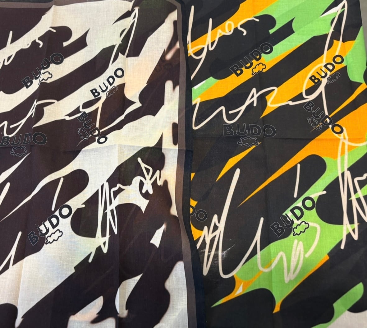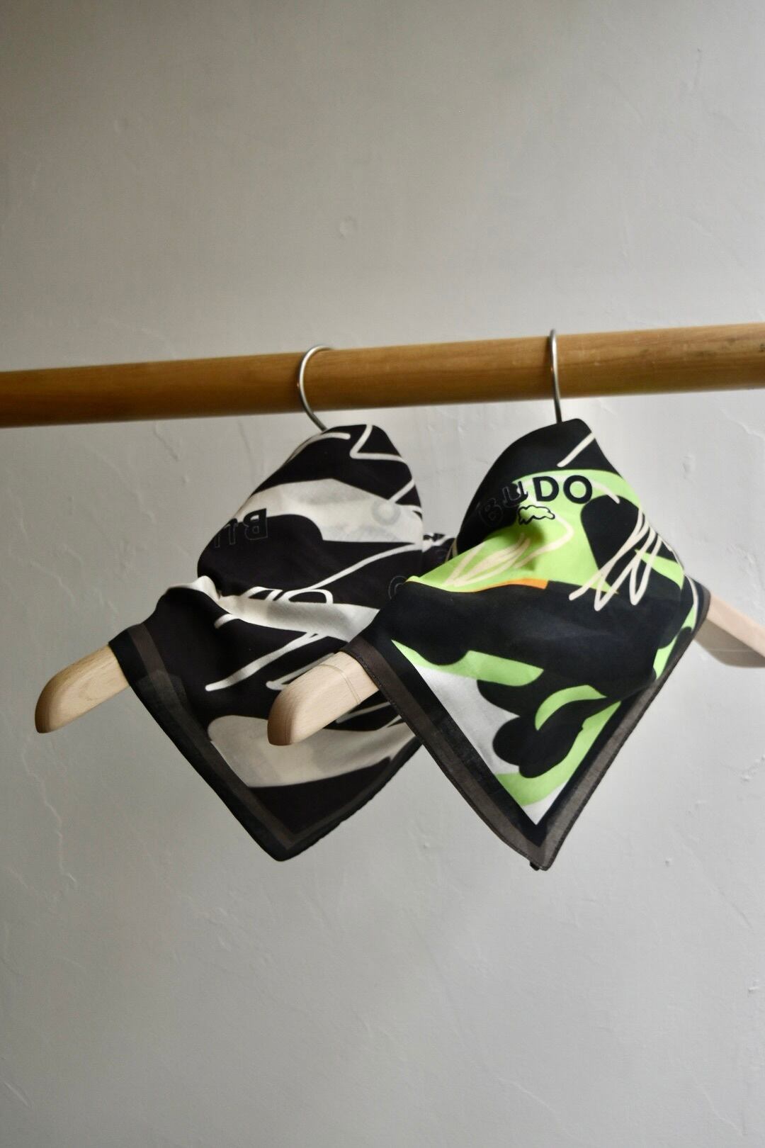 このバンダナはフリーハンド&不規則に構成され、折り方によってはBUDOのロゴが現れたり、現れなかったりします。
