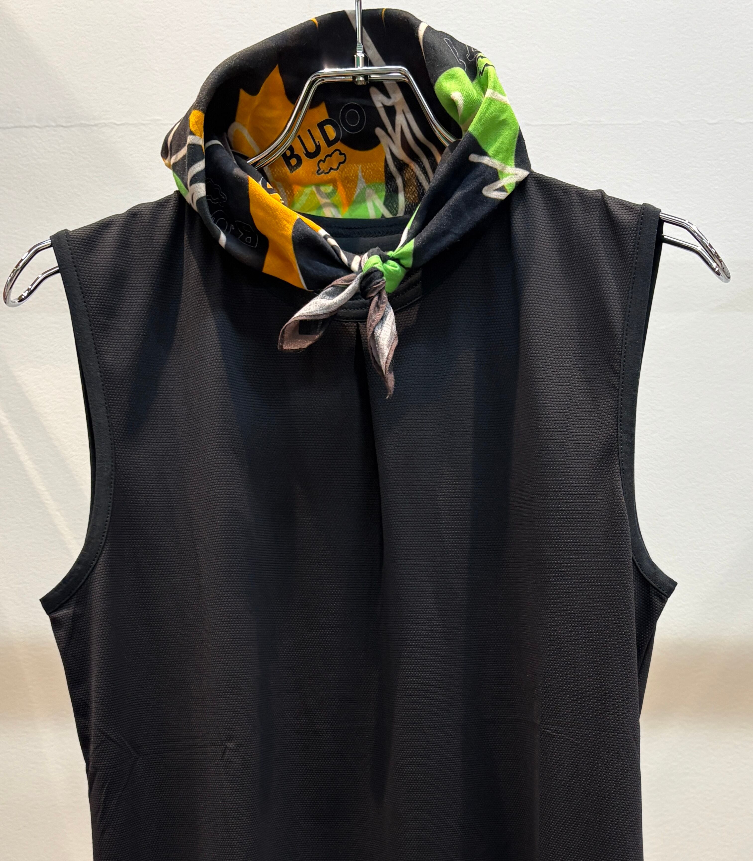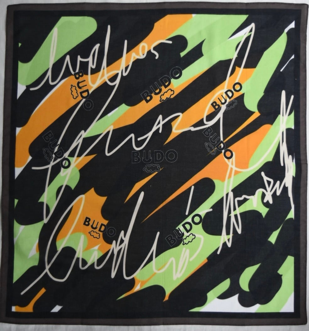 このバンダナはフリーハンド&不規則に構成され、折り方によってはBUDOのロゴが現れたり、現れなかったりします。