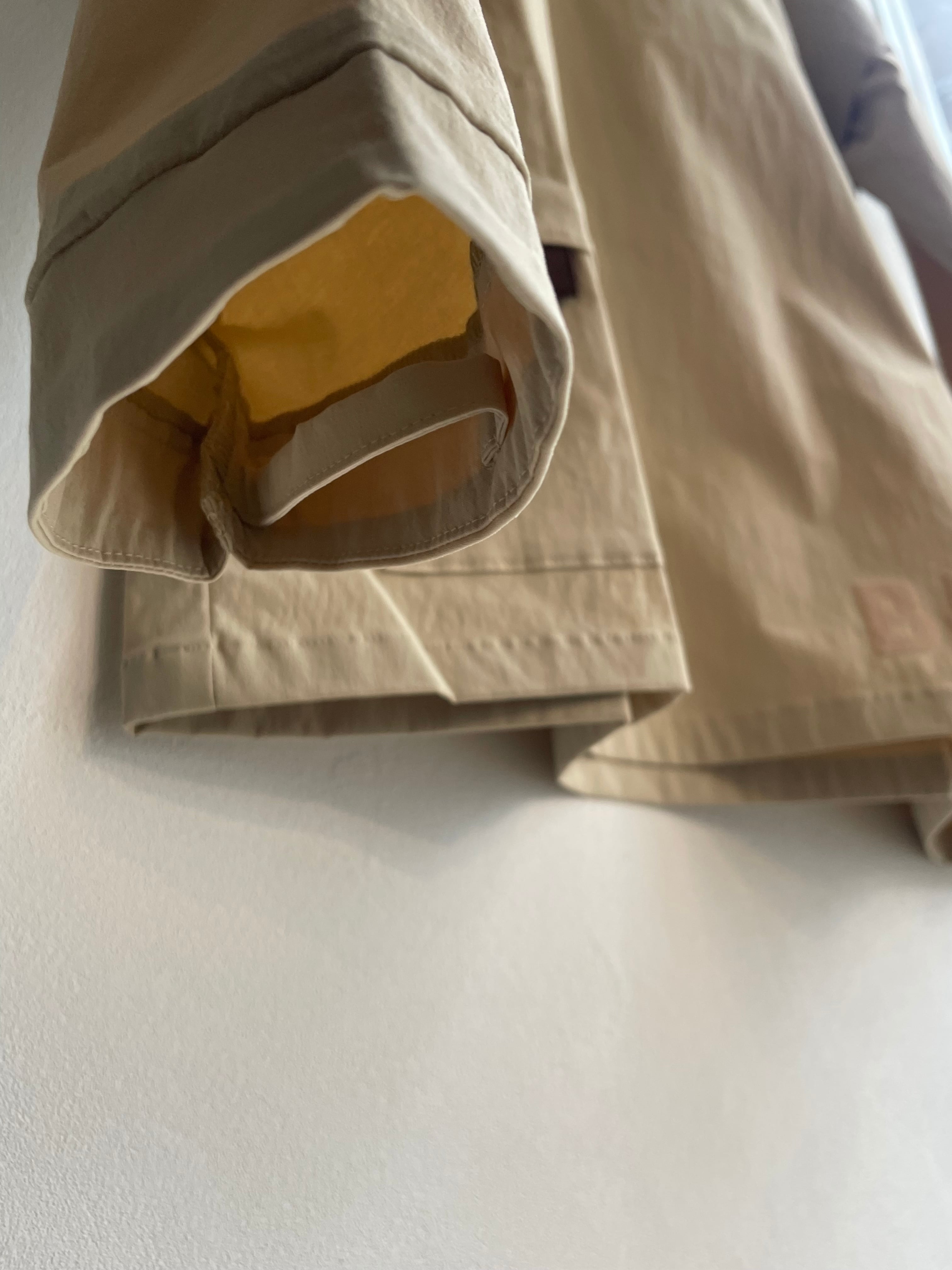 ・ナイロンの弱通気性をふまえ、着用した時に身体と服の間に空気感をより多く感じられるオーバーシルエットとして仕上げました。